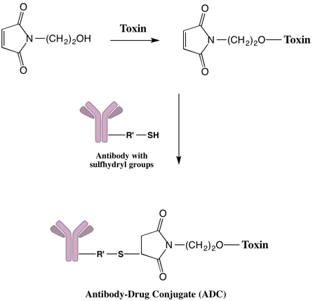 Building blocks from 2-Hydroxyethylmaleimide, and its derivatives, are exceptionally suitable for bioconjugation techniques, as an example applied for "Antibody-Drug Conjugate" (ADC) chemistries (JEPD patent pending). Below is a simplistic and schematic illustration of how 2-Hydroxyethylmaleimide could be used as linker between cytotoxic warheads (aka payloads) with antibodies to form ADC's: