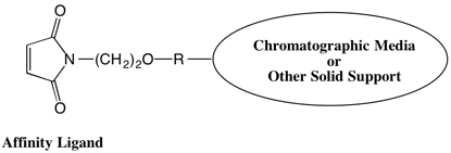 2-Hydroxyethylmaleimide and derivatives thereof are also very suitable for the design of affinity ligands. Chromatography, purification, analysis, and separation media techniques are already, since many years, utilizing maleimide-based affinity ligands for practical applications to purify biomolecules, such as for example proteins and pharmaceuticals, etc. Maleimides from JEPD provide an excellent and enabling tool for these applications to develop new, more pure, designed, and efficient products. Below is a schematic illustration of how an affinity ligand prepared from 2-Hydroxyethylmaleimide, or its derivatives, would be linked to a solid support such as chromatographic beads: